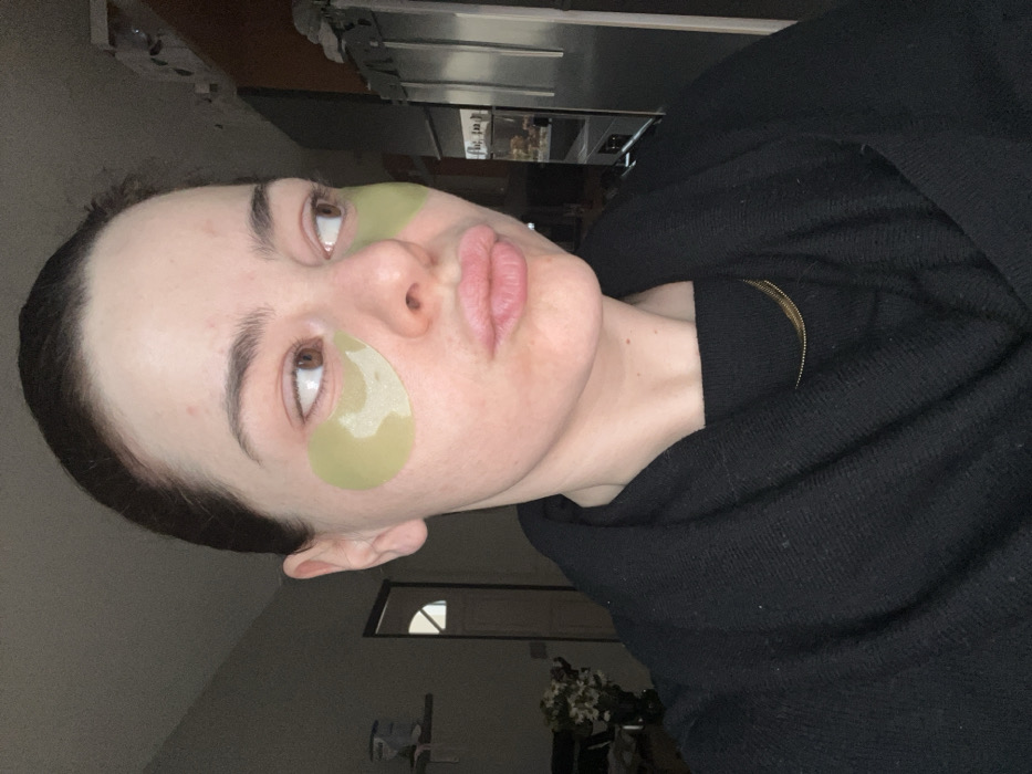 A medium close-up, dimly lit indoor photograph depicts a young adult female, likely in a residential setting within Rueil-Malmaison, France. The subject has fair skin, dark hair pulled back, and visible minor blemishes on her chin and forehead. She wears two translucent, light green, tear-drop shaped cosmetic patches beneath her eyes. Her lips are pursed in a pouting expression, and her brown eyes are directed towards the upper right of the frame. She is dressed in a black high-necked garment, possibly a sweater, covered by a black wrap or shawl. A thin, gold-colored chain necklace is visible around her neck. The background on the left side of the image features a partial view of a white door with a clear glass insert, a white wall-mounted shelf, and a vase containing white flowers. On the right, a large, reflective metallic appliance, consistent with a refrigerator or cabinet, with horizontal segmentation, is partially visible.