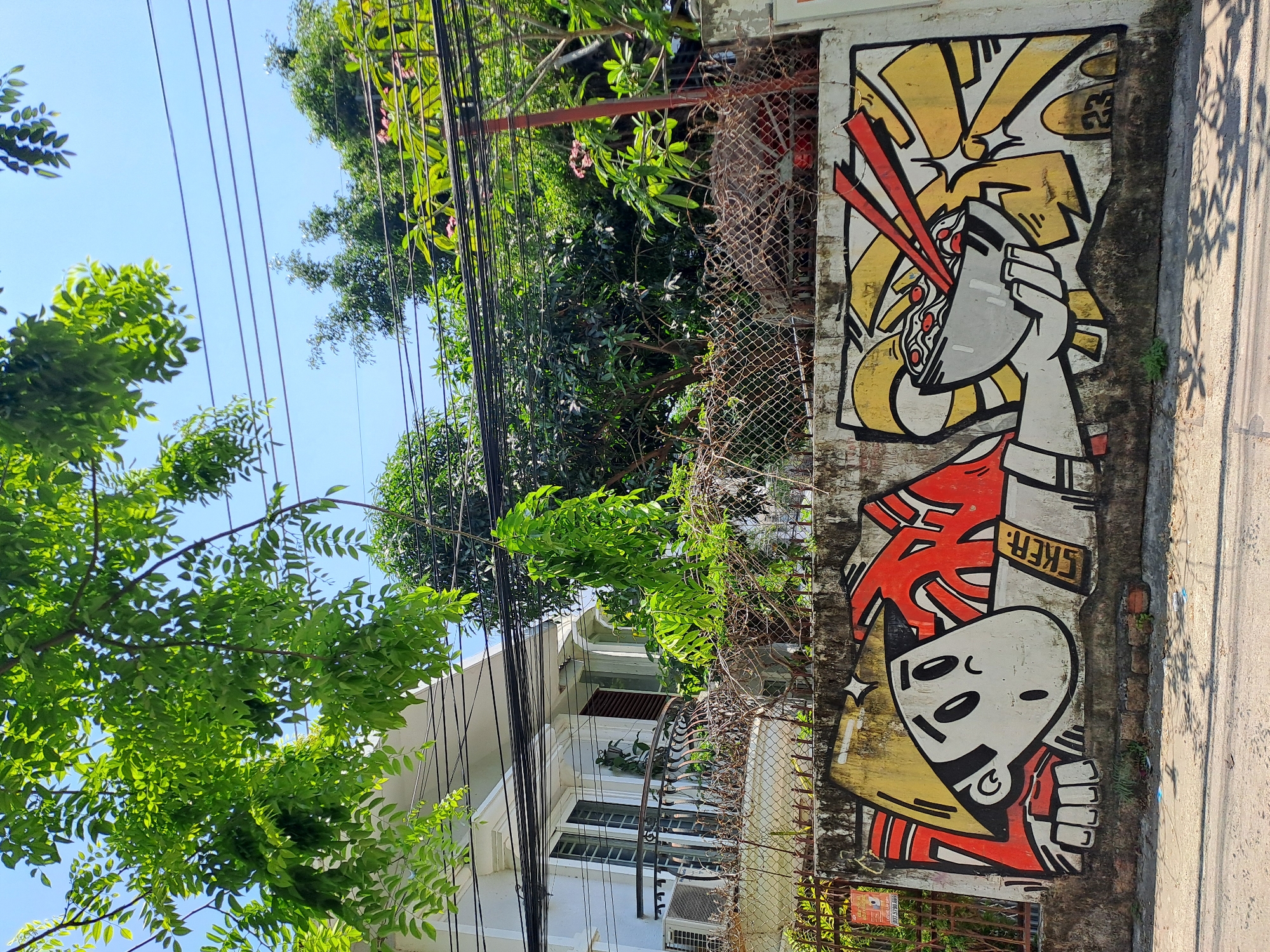 This photograph shows a wall in Nha Trang, Vietnam, with graffiti art. The graffiti is divided into two distinct images. The upper portion features a hand holding a bowl filled with noodles and chopsticks, rendered in a cartoonish style with yellow and red accents. The lower portion is a cartoonish figure, possibly a character design, with red and yellow colors. The word "SKER" is visible on this lower image. The wall is adjacent to a chain-link fence, behind which there are green trees and a building with white walls. Electrical cables are strung above the scene. A concrete street or walkway runs alongside the wall.