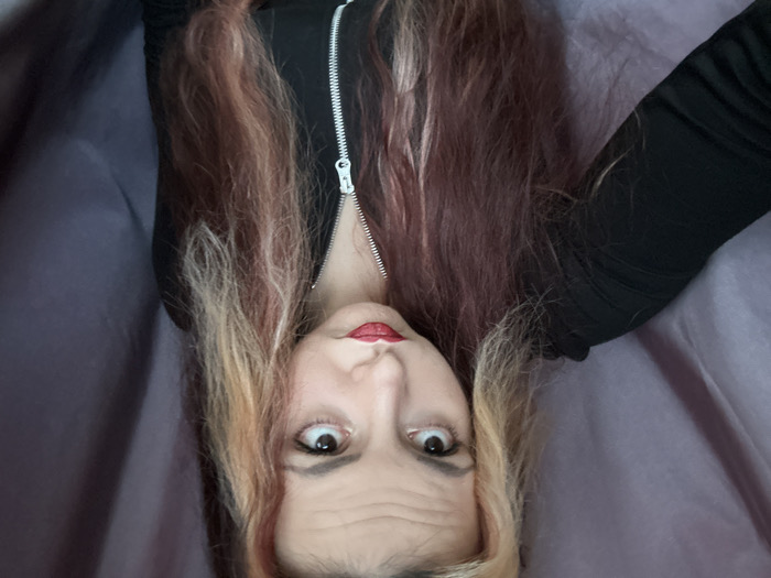 A female individual is positioned in a close-up, chest-up shot. She has multi-toned hair, featuring shades of blonde, auburn, and dark brown, extending over her shoulders. Her face is presented with defined eyebrows, dark eyes looking upwards and slightly to her right, and lips accentuated with red lipstick, held in a slight pout. She wears a black long-sleeved garment with a prominent silver-colored zipper running vertically down the center. The background consists of a uniformly draped, textured fabric in a muted purple or lavender color, displaying soft folds. The setting is indoors, and no specific external or internal architectural landmarks are visible to identify a location within Sofia, Bulgaria.