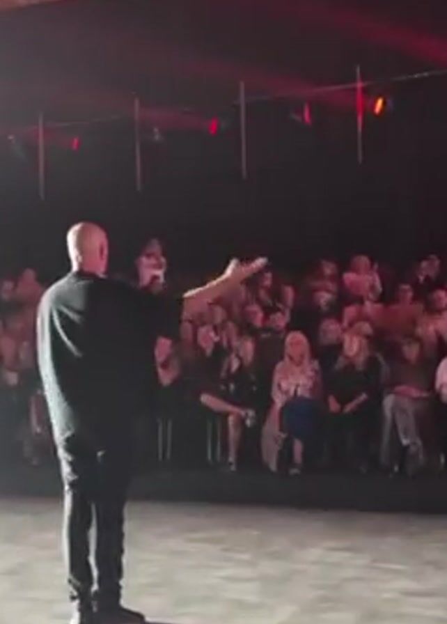 man on a stage addressing an audience. The stage is lit with red lighting. The man is wearing a black outfit, standing alone on the stage, and gesturing with his hands. The audience is seated in rows, and some people are holding up their phones, seemingly to record the event. The setting appears to be a large indoor space with a visible ceiling structure. The man seems to be speaking to the audience, possibly giving a speech or making an introduction. Some members of the audience begin to stand and clap.