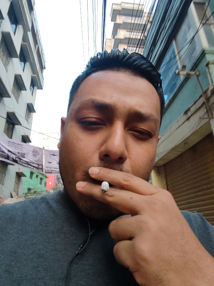 A close-up, slightly low-angle self-portrait depicts a South Asian male, estimated to be in his 30s, with short, slicked-back dark hair and a trimmed mustache. He is wearing a dark grey t-shirt and has an earphone cord visible along his left side. His eyes are partially closed or squinting, and he is holding a lit cigarette with a visible ash tip between his right thumb and index finger, positioned at his lips. The background shows an urban environment characteristic of Dhaka, Bangladesh. On the left, a light-colored, multi-story building with small, rectangular windows and exterior ledges is visible. On the right, a multi-story building with a teal-painted facade and what appears to be a metallic roll-down shutter at ground level is present. Behind this, another beige-colored building rises. Numerous black utility wires crisscross densely across the upper portion of the frame against a bright, overcast sky. A white banner with Bengali text, including "বাংলাদেশ নির্বাচন কমিশন" (Bangladesh Election Commission) and a scale symbol (⚖), is affixed to a pole or structure on the far left, partially obscured by the subject. The overall scene is illuminated by daylight.
