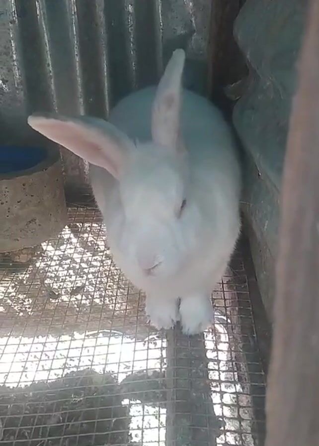 A white rabbit stands on a wire mesh floor inside a cage. The cage is under a corrugated metal roof and has a metal water container visible. The rabbit is facing the camera initially, then turns slightly to its right, revealing one of its pink ears.