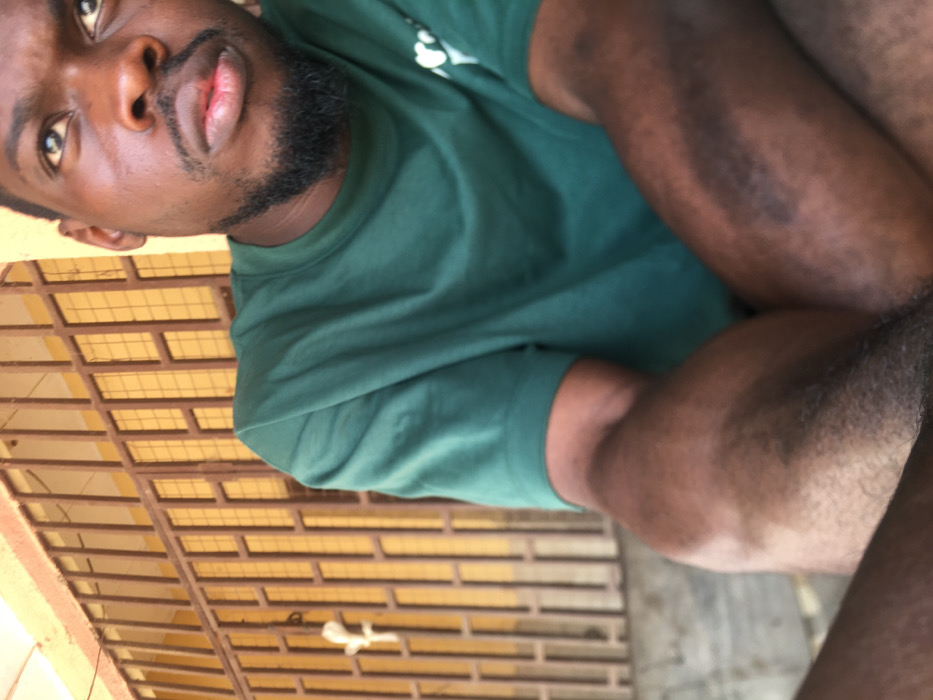 An adult male with dark skin, short dark hair, and a dark beard is depicted in a medium close-up, gazing upwards and to his right. He wears a short-sleeved dark green t-shirt with a partial light-colored logo visible on the right chest. His forearms and portions of his upper legs are visible, displaying dark skin and body hair. His hands are out of frame. The individual is positioned with his arms resting on his knees or thighs, suggesting a seated or crouching posture. The background features a light brown or tan building structure, possibly a wall, behind a set of dark-colored, grid-patterned metal security bars or a grille. A small, irregular white object hangs from the left side of the metal bars. The lighting indicates daylight conditions. The scene is located in Katcha, Nigeria.