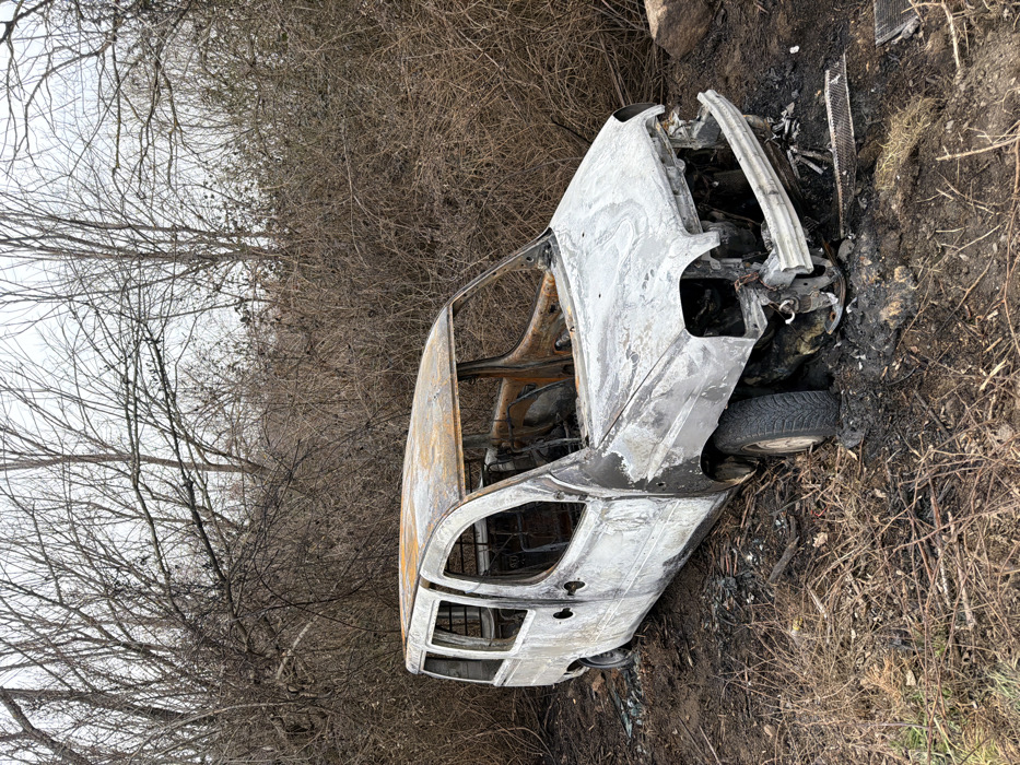In Ravadinovo, Bulgaria, a heavily fire-damaged white panel van, resembling a Fiat Doblo, is situated in a desolate, overgrown outdoor area