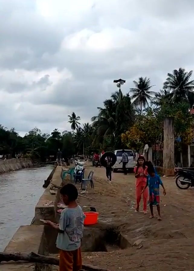 n outdoor scene with a canal on the left and a dirt path next to it. A boy is standing near the edge of the canal, while two girls in pink outfits and a boy in a blue shirt are walking along the path. There's a man carrying a large tire walking on the path as well. A variety of items like chairs, a motorbike, and a car are visible along the path. The background includes palm trees and buildings. The sky is overcast. The video then pans to show a tent with red and white stripes labeled "SOS" and an open area with a large canopy. People are milling around under the canopy, near some large blue barrels. The ground is muddy.