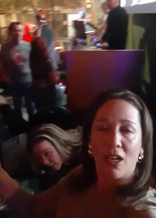 lively party scene inside a bar or club. A woman is holding the camera, taking a selfie video, and she's clearly enjoying herself, singing and dancing. Behind her, a crowd of people are also dancing and raising their hands, caught up in the music. A DJ is visible in the background, standing behind a booth and controlling the music. The bar has large windows showing the street outside. There are drinks and tables scattered around, and the lighting is colorful.