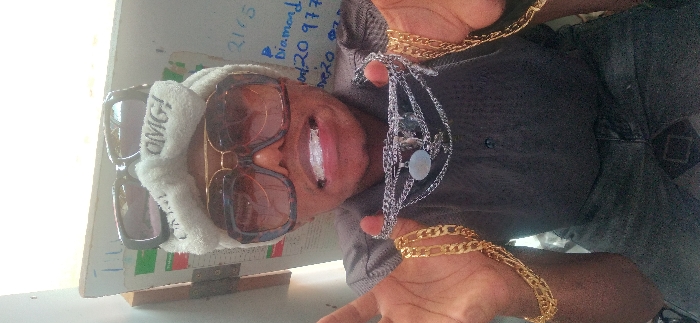 A frontal, medium-shot depicts an individual indoors in Nyeri, Kenya. The subject, an adult with dark skin, wears oversized dark-tinted sunglasses, a light-colored headband with "OMG!" embroidered on it, and a second pair of sunglasses resting atop the headband. A clear dental aligner is visible over their upper front teeth. They are dressed in a dark grey collared shirt and dark trousers. The individual presents jewelry towards the viewer with both hands: the left hand holds multiple gold-colored, thick figaro link chains, and the right hand displays several silver-colored layered chains with various pendants, including an oval light blue pendant. The background consists of a light-colored wall, with blue handwritten text including "2165" and "P. Diamond" visible on a white surface to the right.