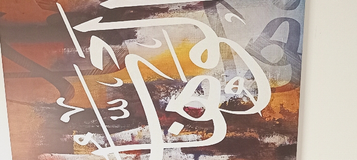 The image displays a close-up, angled view of a framed artwork featuring stylized Arabic calligraphy rendered in white against an abstract, multi-toned background
