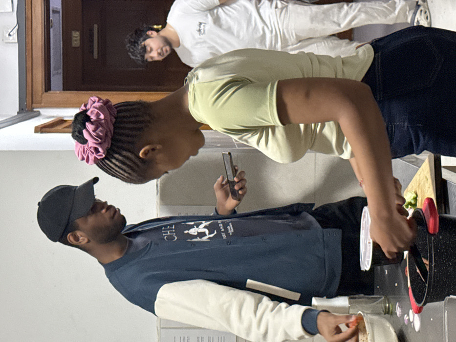 An indoor scene in what appears to be a communal kitchen or common area within Daxing District, China, shows three individuals engaged in or observing food preparation. In the foreground, a Black male, wearing a black baseball cap, a dark blue and cream-sleeved varsity jacket, and a dark graphic t-shirt, stands facing left, looking down. He holds a dark-colored smartphone in his left hand, and his right hand is positioned over a white bowl containing chopped red vegetables, possibly tomatoes or peppers. To his right, a Black female, seen in profile facing right, has braided hair styled with a prominent pink scrunchie. She wears a light green short-sleeved top and dark blue jeans. Her hands are occupied with food preparation: her left hand holds a clear plastic container with a dark substance, while her right hand is near a black pot with red handles on a dark countertop. A wooden chopping board in front of her displays chopped green vegetables. In the mid-ground, a male of Middle Eastern or South Asian descent, with dark, curly hair and a beard, is partially visible, standing within a brown wooden doorway marked with the number "416." He wears a white t-shirt with a dark logo (appearing to be "Stüssy") and light-colored pants. He is looking towards the two individuals preparing food. The countertop displays various cooking items including chopped white onions, a clear spray bottle, and the aforementioned pot and bowls. The walls are light-colored, suggesting a tiled or painted surface. The lighting appears artificial, illuminating the scene from above.