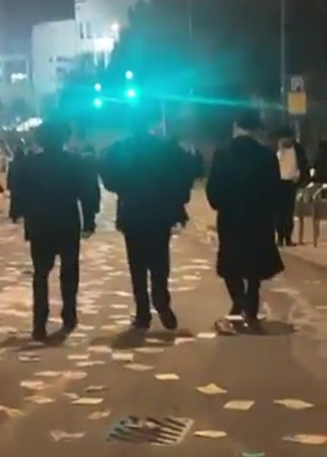 The video depicts a group of people, largely dressed in black coats and hats, walking down a street at night. The ground is covered in what appears to be scattered debris, possibly paper or small pieces of trash. Traffic lights are visible in the distance, shining green. The setting seems to be an urban environment. The camera follows the group from behind as they walk, providing a rear view of their movement through the littered street.