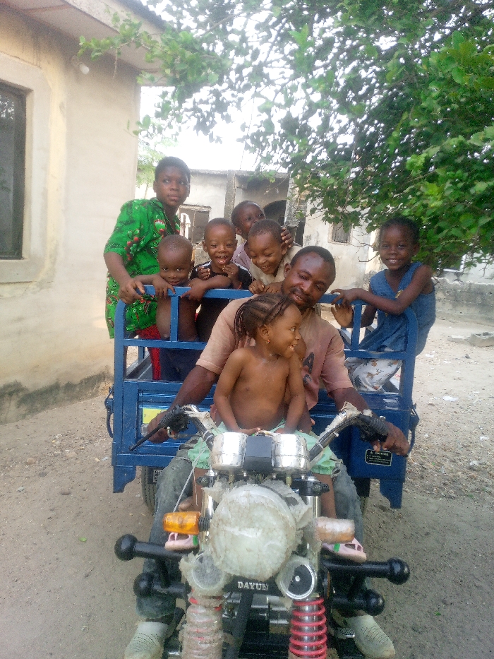 A man sits on a three-wheeled motorcycle with a group of children around him. A little girl is on the front seat, a group of children are seated on the back, and one stands behind. The motorcycle has a blue cargo bed behind the driver's seat. The vehicle is a DAYUN model. The group is outside a residential area.