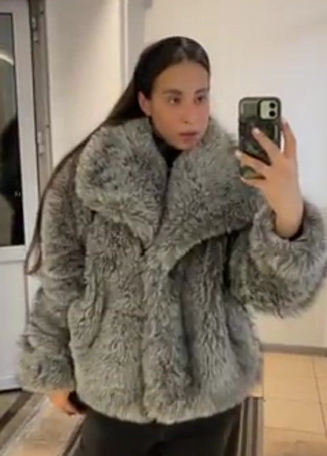 In a well-lit indoor setting, a young woman stands in front of a full-length mirror, capturing her reflection with her phone. She wears a plush, gray faux fur coat with a wide collar, paired with a dark turtleneck and wide-legged black trousers. Her long, dark hair is styled straight, held back with a headband. She appears to be in a hallway with beige tiled floors, white walls, and a glass door in the background. The woman smiles and laughs while adjusting her phone and posing for the selfie. Her phone case features a decorative design. The lighting is bright and even, casting soft shadows on the surroundings.