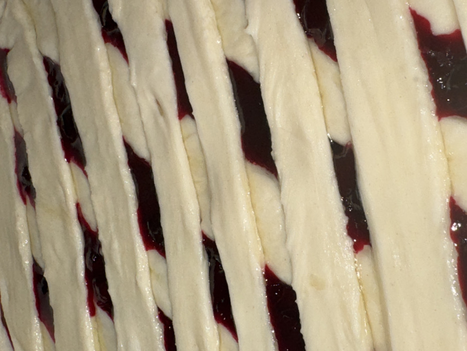 A close-up, overhead perspective captures the uncooked surface of a pastry. The primary subject is a lattice-work pattern composed of approximately seven parallel strips of unbaked, light-colored dough, ranging from off-white to pale beige, traversing the frame diagonally from the top-left to the bottom-right. These dough strips are of roughly uniform width and thickness. Dark red, viscous filling, consistent with fruit jam, is visible in the elongated gaps between the dough strips and beneath them. The filling exhibits a moderate sheen. Minor seepage of the red filling onto the edges of some dough strips is discernible. The dough appears raw, soft, and slightly hydrated, with a faint gloss on its surface, possibly indicating a liquid application. No individuals, tools, or ongoing actions are present or implied within the frame. The image contains no visual information that allows for the identification of a specific location within Tel Aviv-Yafo, Israel, or any other geographic area.