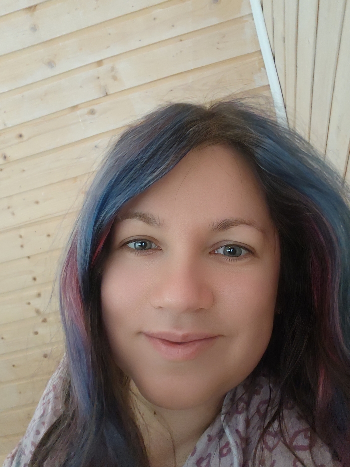 A headshot portrait depicts an adult female subject positioned centrally, facing directly towards the camera, against a light-colored wooden plank wall in Свистуха (кузяевский С/о), Russia. The subject has light skin, blue-green eyes, and dark hair with prominent blue and subtle pink streaks visible on the sides and crown. Her hair appears to be parted slightly off-center to the left. She exhibits a slight smile with closed lips. Her eyebrows are dark brown, and there is no visible makeup around her eyes. A portion of light-colored fabric with a patterned texture, possibly a scarf or clothing item, is visible draped around her neck/shoulder area on the lower right side of the frame. The wooden wall in the background consists of horizontally aligned planks with visible grain and knots, and a thin white vertical element, possibly a wire or trim, is visible on the upper right side. The lighting appears even, suggesting an indoor environment.