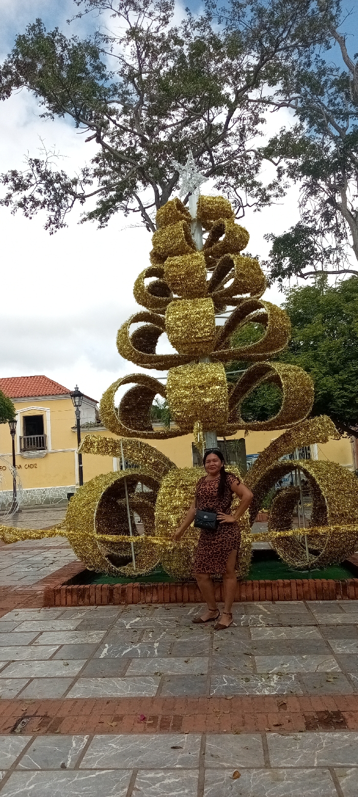 A full-color, outdoor vertical photograph depicts a woman standing next to a large, golden, tinsel-covered decorative structure in a public square in La Asunción, Venezuela