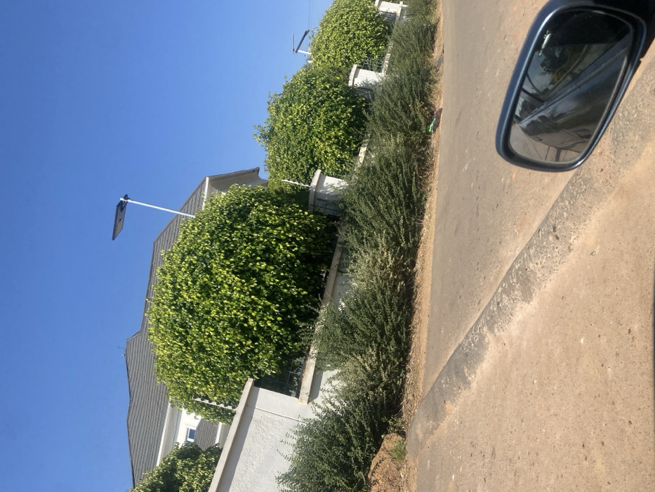 The image depicts an exterior street scene in the city of Unknown, Unknown, under a clear blue sky. A multi-story residence with a dark grey gabled roof is partially visible in the background, situated behind a tall, light-colored perimeter wall. This wall is topped with an electric fence, indicated by thin wires and insulators. Large, densely foliated green bushes, trimmed into spherical shapes, are positioned behind and above the wall, partially obscuring the residence. Smaller, variegated green and white shrubs are planted along the base of the wall, bordering a dirt and sandy shoulder. An asphalt road with a grey concrete curb extends across the foreground, diagonally from the lower left to the mid-right. Several modern solar streetlights, characterized by dark, flat panels mounted on light-colored poles, are visible above the vegetation and wall. The lower right corner of the frame shows the dark casing and reflective surface of a vehicle's side-view mirror, which reflects a blurred image of the vehicle's side and environmental elements. A small piece of green and brown debris is present on the dirt shoulder to the right of the road. No individuals are visible in the scene.