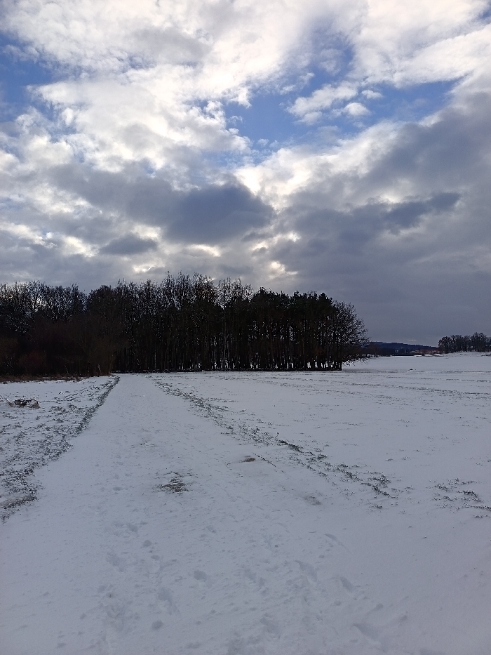 The image displays a snow-covered rural landscape located in Kamenz - Kamjenc, Germany. In the foreground, a track or path covered with disturbed snow extends from the bottom center, receding into the middle distance and veering slightly towards the left. This track is bordered on both sides by extensive snow-covered fields, which show faint, linear depressions, possibly tire tracks, particularly on the right. A prominent, dense line of dark trees, appearing to be a mix of deciduous and coniferous types, forms a distinct horizon line across the midground, silhouetted against the sky. Some reddish-brown undergrowth is visible to the far left of the treeline. In the background, beyond the treeline to the right, additional snow-covered terrain and distant tree clusters are discernible. The sky above is partially overcast, featuring a mix of grey and white clouds interspersed with patches of clear blue sky. No individuals, animals, or active human interactions are depicted within the scene.