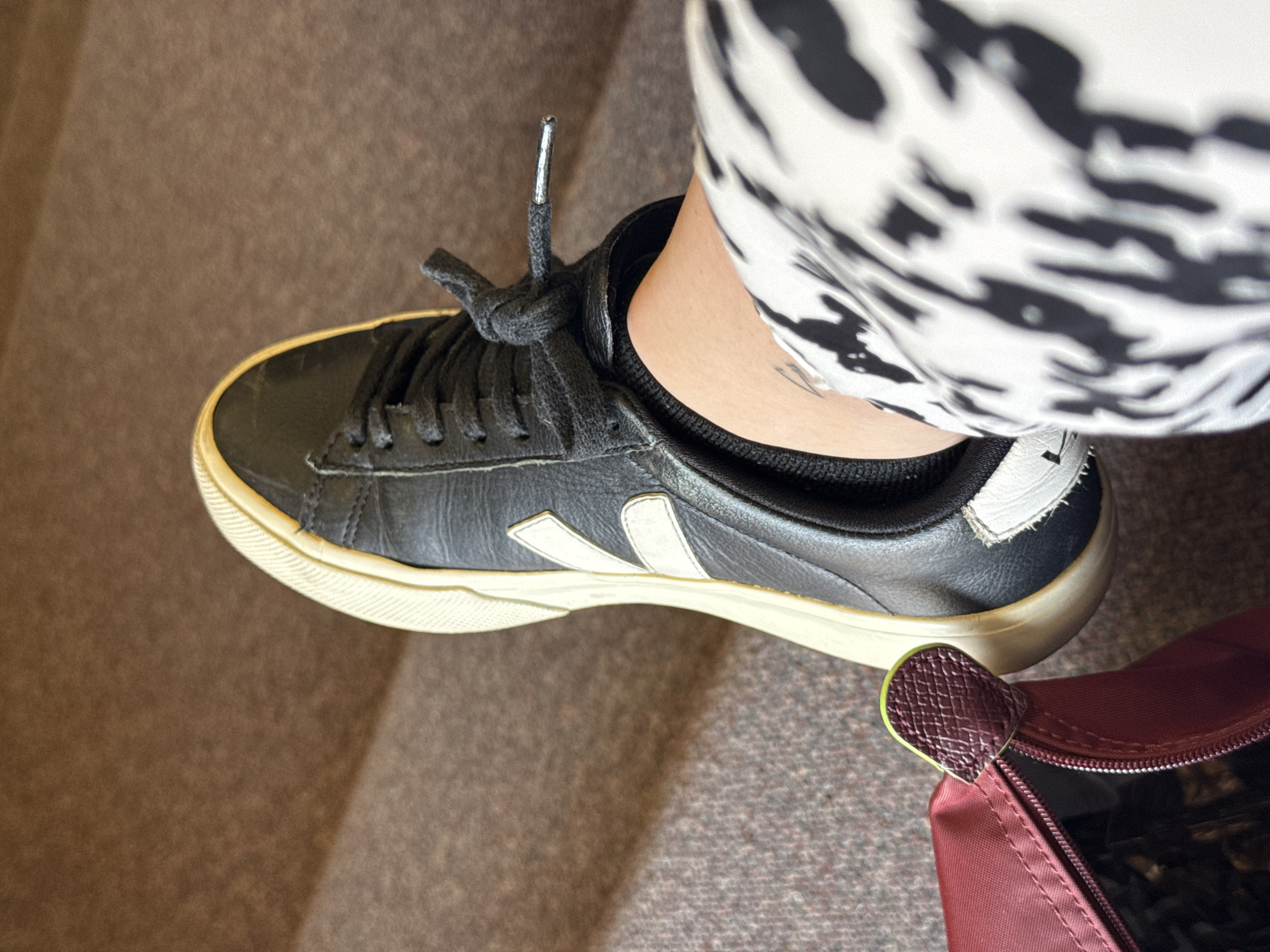The image presents a high-angle view focusing on a person's lower right leg and foot, resting on a brown, textured surface, likely carpet, in Ciudad López Mateos, Mexico. The person wears black socks and a garment with a distinct black and white abstract or animal print pattern on their leg. A faint tattoo is visible on the outer ankle. Their right foot is fitted with a black leather sneaker featuring a prominent white "V" logo on the side, an off-white sole, and black laces tied with silver aglets. In the lower left foreground, a partially visible maroon fabric pouch or small bag is present, featuring a unique zipper pull tab composed of a dark red textured material accented with a bright lime green element. A diagonal shadow line is cast across the brown background surface.
