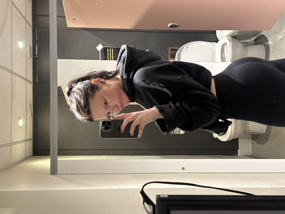 The image displays a female individual taking a mirror selfie in what appears to be a restroom facility, located in Tonbridge and Malling, United Kingdom. The individual is observed from a slightly angled side profile, looking directly towards the camera of a dark-colored smartphone, held in her right hand (as reflected). She wears a black cropped hooded sweatshirt and dark, form-fitting leggings. Her dark hair is pulled back in a ponytail, and she is wearing thin, gold-rimmed glasses and small, dark in-ear headphones in both ears. Her facial expression exhibits a slight pout. The background, visible in the mirror's reflection, consists of a multi-toned room. A dark grey wall is prominent centrally, with a lighter, possibly off-white, wall section to the left. Two white ceramic toilets are visible against the dark grey wall; the toilet immediately behind the individual's lower body has its seat and lid raised. To the far right, a muted pink/peach colored partition or door is present, featuring a circular silver handle or latch. A white square notice or sticker is affixed to the dark grey wall above the visible toilets. The ceiling is a grid-style suspended panel ceiling, incorporating recessed circular light fixtures, one of which is illuminated directly above the individual's reflected head. On the far left, a black frame and a dangling black cable are partially visible, suggesting additional fixtures or furniture outside the primary mirrored area.