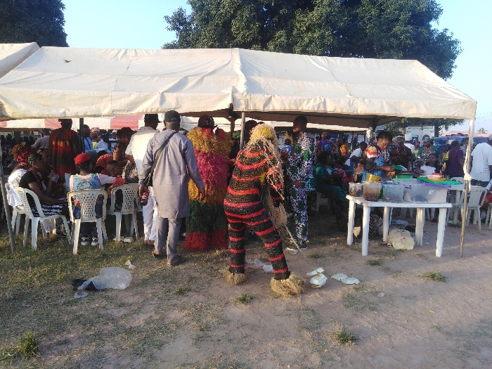 This image depicts an outdoor social gathering under a large white canopy in Barden Yana, Nigeria. Numerous individuals are present, including adults and children. On the left, people are seated on white plastic chairs around white plastic tables. In the mid-ground, a man in a grey tunic and black cap stands with his back to the camera, carrying a black shoulder bag. Two figures in elaborate traditional-style costumes are prominent: one in a multicolored shaggy outfit (red, green, yellow) is partially obscured, while another in a black and red striped woven costume with shaggy beige leg coverings is bent over, facing away from the camera, interacting with several white polystyrene-like objects on the dry, sparse grass ground. A white plastic table on the right displays multiple clear plastic containers filled with food or liquids, attended by a woman in a patterned dress. A clear plastic bag containing unknown contents lies on the ground to the left. Green trees are visible in the background against a clear, light blue sky.