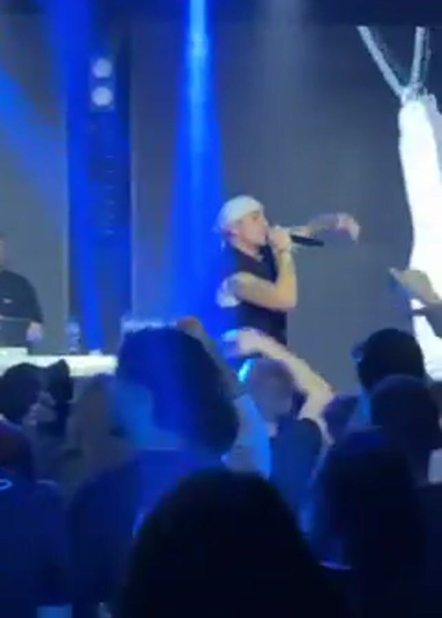 A male performer is crowd-surfing on a group of people at a concert. The performer has a light complexion, and wears a white head covering, a white t-shirt with a black vest, and camo-patterned pants. He is holding a microphone and rapping to the crowd. The audience members are mostly facing the stage with their arms raised in the air. There is a man standing behind a mixing board on the left side of the stage. Behind the performer is a large screen with a white graphic displayed. The lighting changes throughout the video, including white, blue, and yellow spotlights.