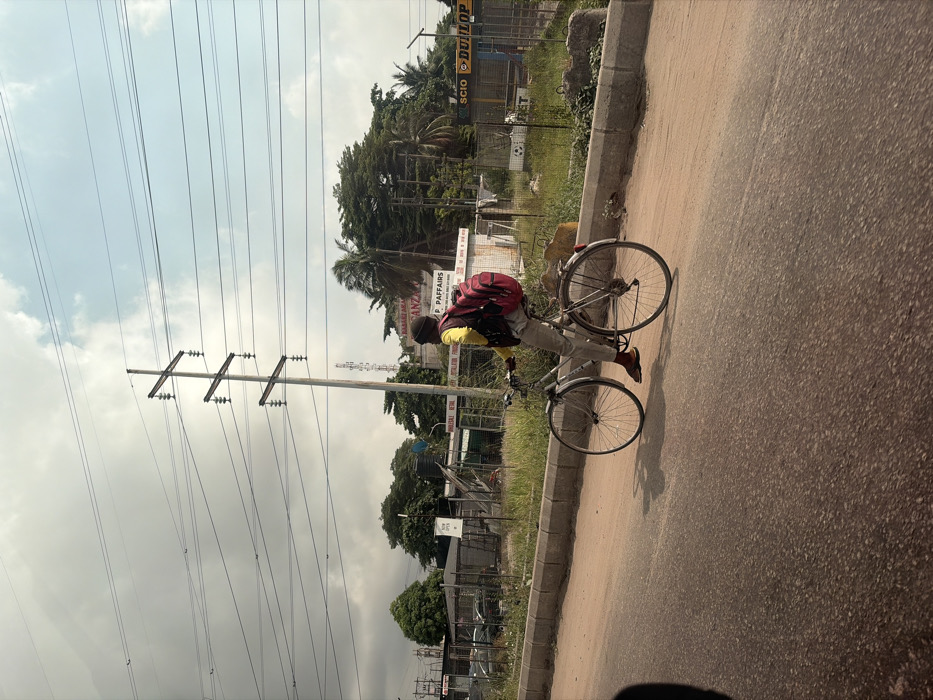 The image depicts a street scene in Ikota, Nigeria, under a partly cloudy sky. In the foreground, an individual, appearing male, rides a silver bicycle on a paved asphalt road, positioned right of the frame's center. The rider wears a bright yellow long-sleeved shirt, light-colored trousers, a dark head covering, and brown shoes. A red backpack is visible on the rider's back. To the right of the paved road is an unpaved dirt shoulder, separated by a concrete curb from a strip of green grass and weeds. In the midground, a tall utility pole with three sets of insulators and multiple overhead power lines stands prominently. Behind it, various commercial structures are visible, including one with a partial sign reading "BANZAN" and another sign clearly stating "P. PAFFAIRS". Further to the right, another sign with "SCIO DUNLOP" is visible. Multiple trees, including palm trees, are interspersed among the buildings. To the left of the main utility pole, a white cellular tower is present. The background shows a mix of light blue sky and scattered grey clouds, traversed by numerous thin power lines. Vehicles are partially visible within a fenced area on the left side of the midground.