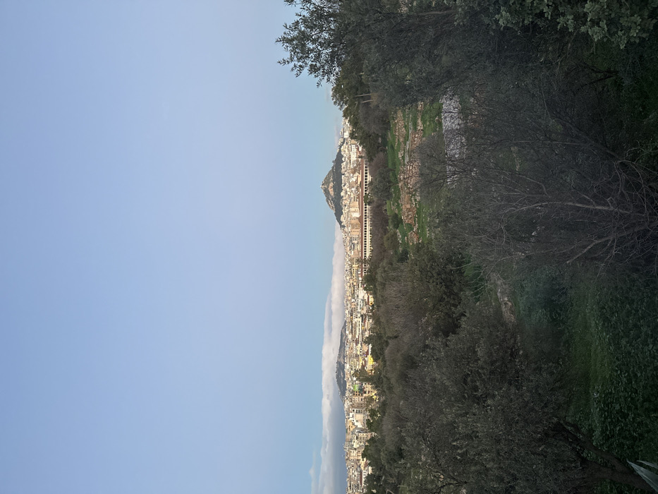 This image captures a panoramic view of Athens, Greece, observed from an elevated position overlooking the Ancient Agora, likely from the slopes of the Acropolis or Philopappos Hill, looking generally north-northeast. The scene is devoid of human figures or discernible activity. In the foreground, a dense expanse of unkempt vegetation dominates, featuring a mix of deciduous trees with bare branches, evergreen shrubs, and patches of green grass, indicative of late winter or early spring. Rocky terrain and scattered stone elements are partially visible within this natural landscape. The midground reveals archaeological remains, characterized by visible stone foundations and disturbed ground, transitioning into a more structured architectural element. Prominently centered is the Stoa of Attalos, identifiable by its elongated, multi-columned facade, positioned behind the immediate ruins. Beyond these historical elements, the background presents the sprawling urban fabric of Athens. Numerous multi-story residential and commercial buildings, predominantly light-colored, extend across the cityscape. The horizon is punctuated by two significant hills. To the right, Lycabettus Hill rises distinctly, capped by a small white church (St. George's Church) and a flagpole. To the left, another, slightly lower hill is visible. A light, hazy atmospheric layer, possibly cloud cover or urban haze, is present above the distant city buildings and between the hills. The sky above is clear blue, with minimal, elongated cloud formations near the far left horizon.