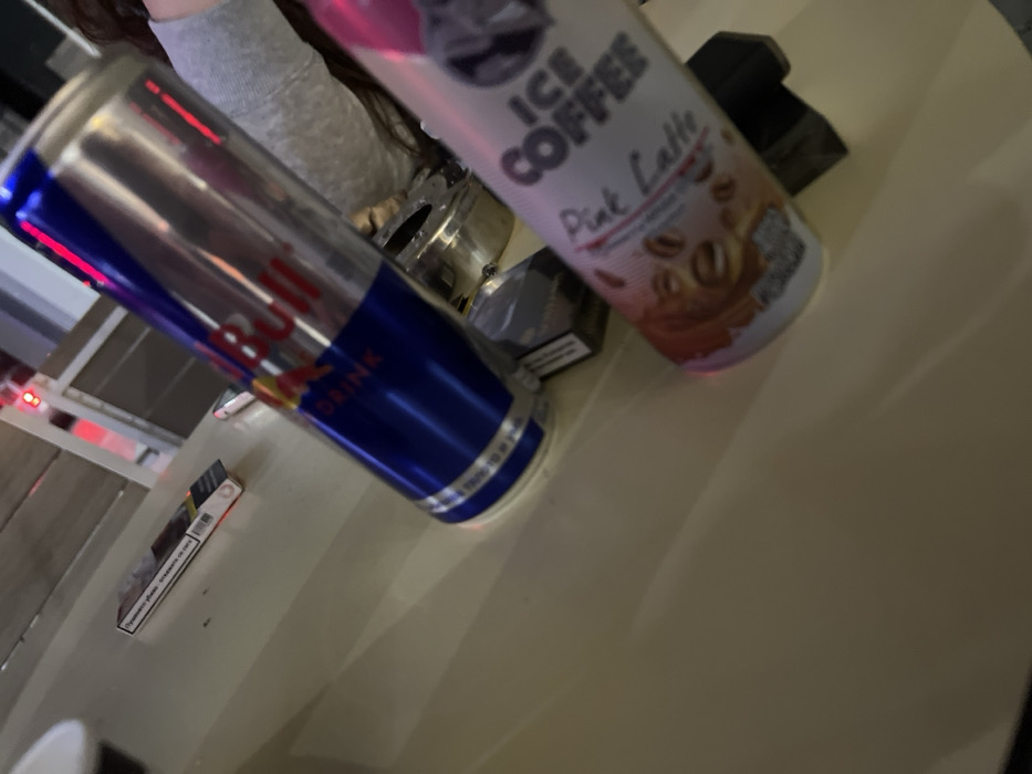The image displays a close-up, angled view of a light-colored table surface in an indoor setting. On the table, a silver and blue Red Bull energy drink can is positioned prominently, leaning slightly to the right. To its right, a white and pink "Ice Coffee Pink Latte" can is visible in the foreground, also leaning slightly. Between these two cans, a metallic, circular ashtray containing dark residue is present. To the left of the Red Bull can, a white and red cigarette pack, bearing Bulgarian text, rests on the table. A second, darker cigarette pack is partially visible behind the "Ice Coffee" can, near the ashtray. A segment of a person's upper arm or shoulder, clad in a light grey long-sleeved garment, is visible on the far right edge of the frame. The background is out of focus, revealing indistinct indoor architectural elements and a red light source. The precise location within Piperkov Chiflik, Bulgaria, is not discernible from the visual evidence provided.