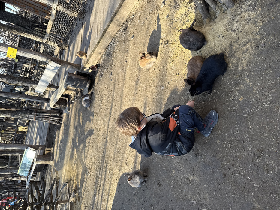 This image depicts an outdoor animal enclosure, likely a petting zoo or park exhibit, located in Shakhty, Russia, under bright daylight conditions. The scene is dominated by a young male child, estimated to be between 5-8 years old, with light brown hair and wearing glasses. He is crouched on the dirt ground in the foreground, wearing a dark-colored winter jacket with orange and white accents, dark trousers, and grey athletic shoes. His right hand extends forward, holding a handful of dry grass or hay, which he appears to be offering to several rabbits clustered directly in front of him. In front of the child, three rabbits are present: one black, one dark brown, and one dark grey/black, all facing his outstretched hand. To the child's left, a light grey rabbit sits on the dirt. Further into the scene, an additional light brown rabbit is seated on the dirt ground to the right of the child. In the mid-ground, a grey and white rabbit rests on the dirt near a wooden structure. Another light brown rabbit is positioned on an elevated wooden walkway in the background. In total, eight domestic rabbits of various colors (grey, brown, black, tan, grey-white) are visible. The ground is predominantly packed dirt with scattered dry grass and some patches of lighter, sandy soil. Distinct shadows are cast across the ground, indicating strong sunlight. The background features a rustic environment constructed with logs and wooden elements. Elevated wooden walkways, supported by thick wooden posts, traverse the scene. Wooden benches, also crafted from logs, are integrated into these structures. A rough wooden fence made of intertwined branches and a mesh fence are visible. A yellow rectangular sign with a black pictogram is affixed to a wooden post on the elevated walkway.