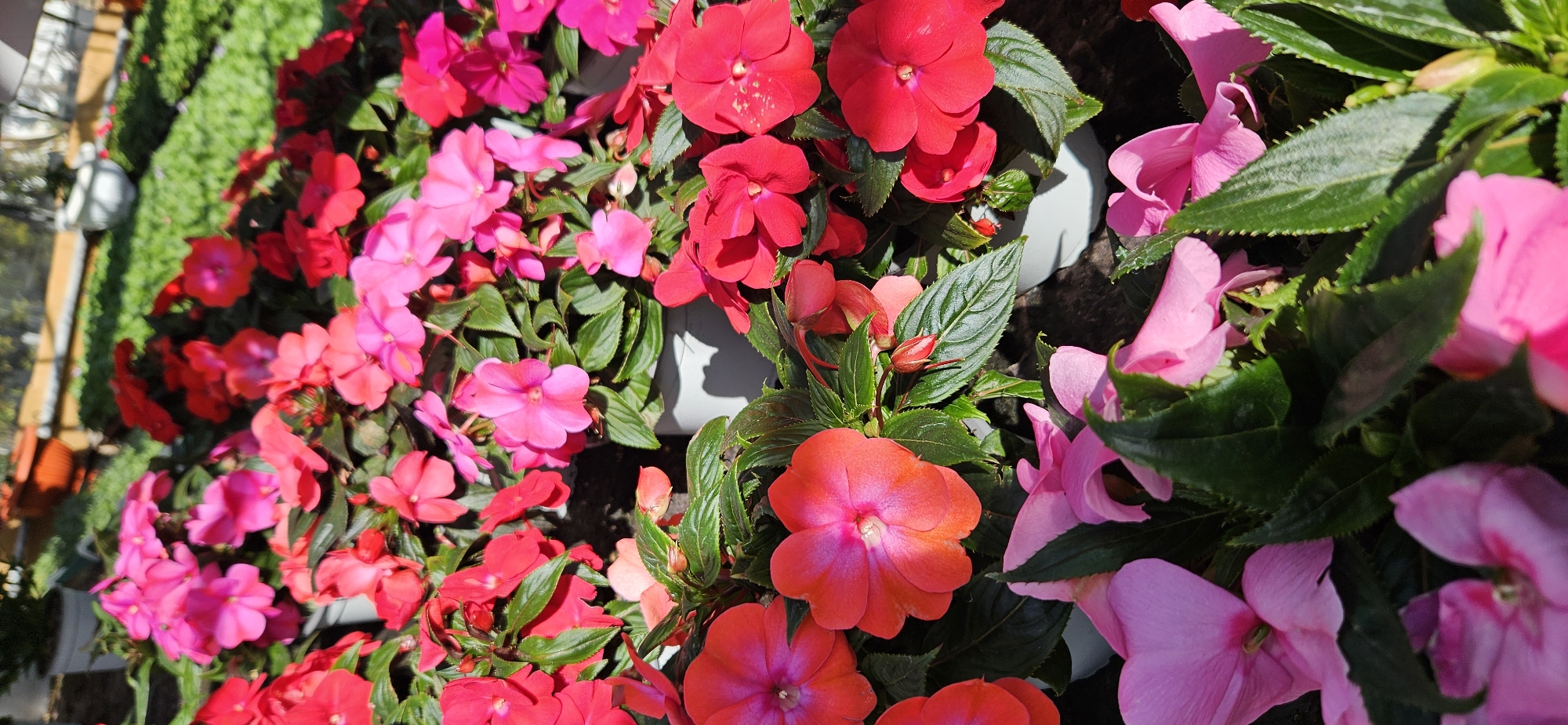 The image depicts a close-up view of a dense arrangement of flowers, primarily impatiens