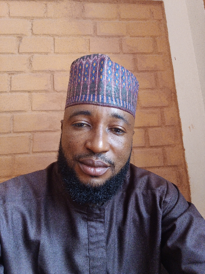 An adult male subject with dark skin and a full black beard is depicted in a head and upper torso portrait. He wears a dark, possibly brown or maroon, long-sleeved garment with a collar and a patterned cap (Kufi/Fila) featuring geometric designs in blue, purple, red, and gold hues. His gaze is directed forward towards the camera, with a neutral to slightly smiling facial expression. The background consists of an indoor wall. The left side of the wall displays a faux brick pattern in light brown tones, while the right side is a smooth, lighter-colored, possibly painted, wall with a distinct vertical seam. The specific location within Jos, Nigeria, is not discernable from the visual evidence provided in the image.