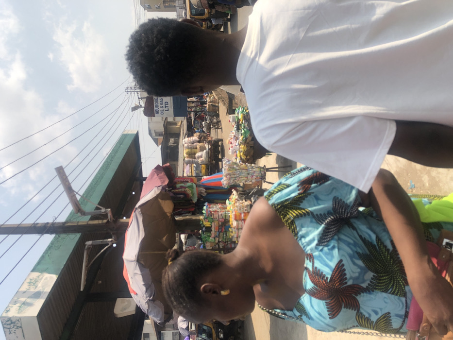 A busy marketplace scene is captured from a close perspective. A woman in a blue patterned dress with floral designs is in the foreground, partially obscured by a man in a white shirt. Behind them, vendors display a variety of goods, from stacked bags to colorful plastic items. A building with a green awning and electrical lines is visible, along with street signs reading "Nduimore Oil & Gas LTD". The sky is partly cloudy, suggesting a bright, busy day in the market.