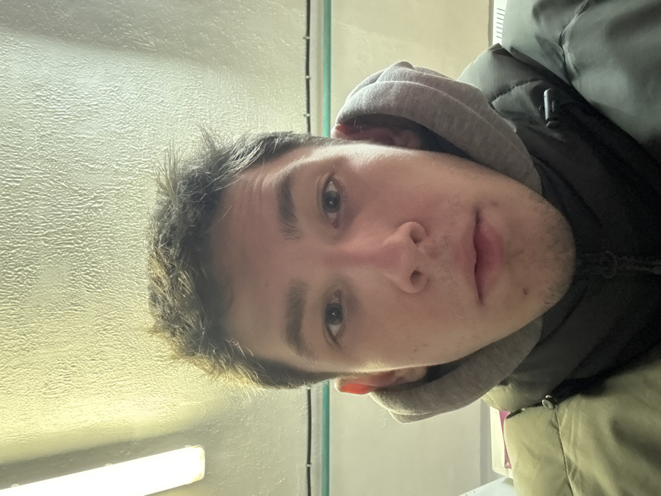 The image depicts a close-up frontal view of a young adult male, situated in an indoor environment within the city of Shushary, Russia