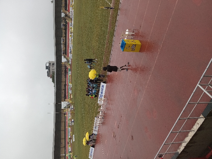 An outdoor track and field stadium is shown in rainy conditions. Spectators fill the stands along the side of the field. A group gathers on the grass, and some hold umbrellas. A yellow and blue box sits on the red track, and a person stands nearby. Numerous white chairs are lined up along the grass, and advertising is visible along the stadium's perimeter.