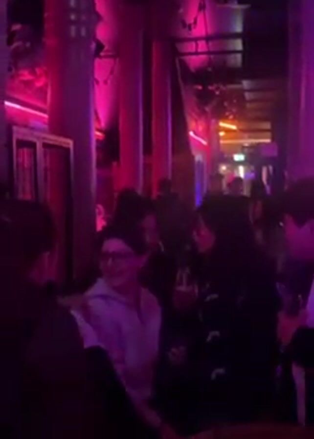 dimly lit indoor scene, likely a bar or nightclub, filled with people. The space is illuminated by pink and purple neon lights, which create a vibrant atmosphere. There are numerous columns visible throughout the area. The crowd consists of people of various ages and ethnicities, some standing and talking, others moving through the space. In the foreground, a woman wearing glasses smiles at the camera. Some patrons are holding drinks. The overall impression is that of a crowded, lively social setting.