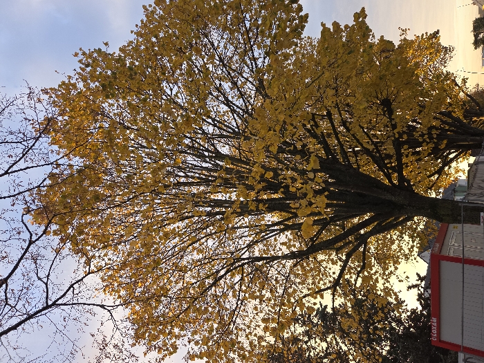 - "A large tree with bright yellow leaves dominates the frame, its branches reaching towards a sky with hints of light blue and orange" by FM-yER7B2, licensed under CC BY 4.0