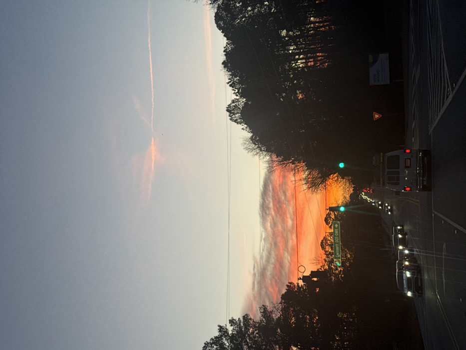A vertical image shows a sunset viewed from a road. The sky transitions from light gray to orange with streaks of red clouds. A faint contrail cuts across the upper left. Trees line the right side, silhouetted against the colorful sky. A road is visible at the right with cars in a line. Green traffic lights punctuate the scene along with a street sign.