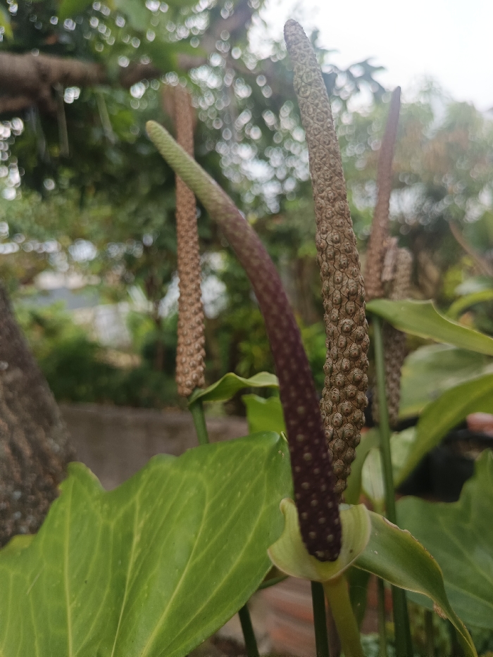 The image displays a close-up, upward-angled view of several Anthurium plant spadices and associated foliage in an outdoor environment