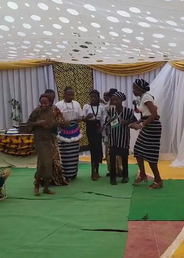 group of people dancing on a green and yellow floor under a white tent. There are about 8 people, most of whom appear to be young women or teenagers. They are dressed in a variety of outfits, some in traditional African clothing, and others in more casual attire like a t-shirt and skirt. They are dancing to music, but the music is not visible in the video. The tent has a white fabric top with a polka-dot pattern and white and gold fabric draped along the sides. In the background, there is a table set up with food or decorations. The camera is static and the view is from a low angle.