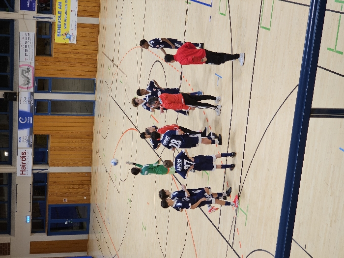 A group of young people are playing futsal on a wooden court with painted lines. Several players wear matching dark blue jerseys with white lettering, while others wear red and green. The goalie is wearing a green jersey and is kicking the ball. The players are lined up on the court, and one player wears a jersey that says “Asport”. A metal pole is on the edge of the image to the right. The indoor court has advertisements on the wall.