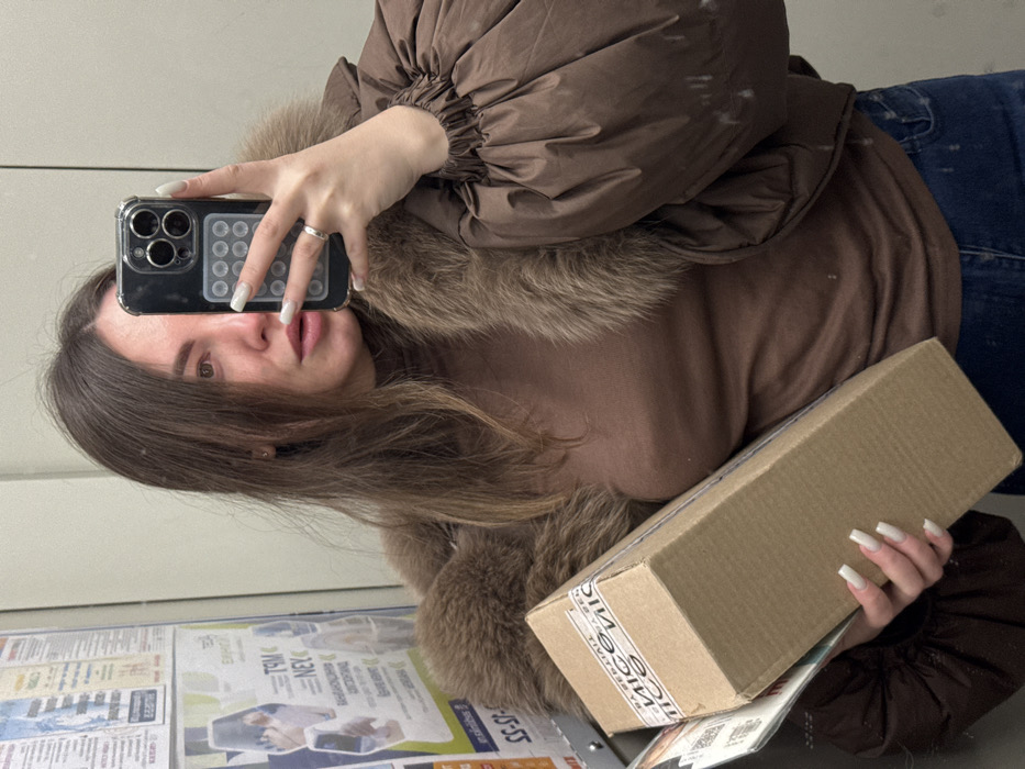 The image depicts a female subject capturing her reflection in an indoor mirror, specified as Orekhovo-Zuyevo, Russia. The subject has long, brown hair and is dressed in a brown high-neck top, a brown puffer jacket with a fur-trimmed collar, and blue jeans. Her left hand, featuring long white manicured nails and a silver ring on the ring finger, holds a black iPhone 14 Pro/Pro Max model in a clear case with a light gray pop-it accessory on the back. Her right arm supports a vertical, rectangular corrugated cardboard box. A white tape strip with repeating 'NICE' text is visible on the box's upper portion. Beneath the box, a stack of papers or brochures, one displaying a QR code, is partially visible. The background consists of a wall or door covered with several posters containing Cyrillic text. White smudges are apparent on the subject's right jacket sleeve and on the reflective surface near her lower torso.