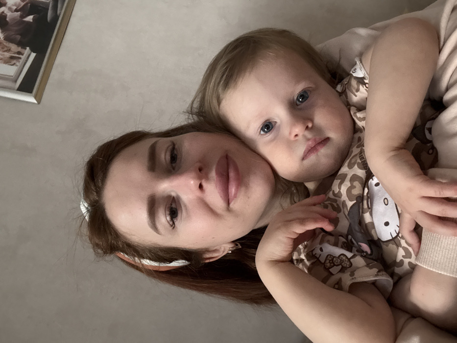 This image captures two individuals in a close embrace, located in the city of Bol'shie Mkhi, Russia. A woman with long, reddish-brown hair, styled with a light-colored headband, occupies the left side of the frame. She has prominent lips and wears a small, gold-toned, heart-shaped earring in her visible left ear. Her upper torso is visible, clad in a dark garment. Nestled against the woman's right shoulder and chest is a young child with light brown hair and blue eyes. The child wears a light brown and black patterned top featuring a leopard print and Hello Kitty faces. Both subjects are looking directly towards the camera. The background consists of a plain, light-colored wall. In the upper right quadrant, a framed object with a light-colored frame is partially visible, containing what appears to be a reflection or image of an indoor setting with a window. The scene is illuminated by even, ambient indoor lighting.