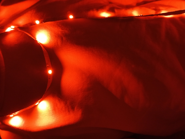 red-toned close-up of a textured surface, likely fabric, illuminated by a string of red lights