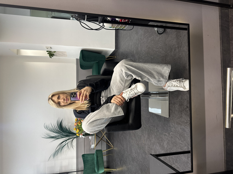 The image displays a woman taking a mirror selfie inside a modern hair salon, located in Berlin, Germany. The woman, with long blonde hair, is seated in a black hydraulic salon chair with a polished chrome base. She is dressed in a black top, a black open cardigan or hoodie, light grey wide-leg jeans, and white sneakers with grey and pink detailing. Her left leg is crossed over her right, and she holds a purple-cased smartphone in her right hand, positioned to capture her reflection. The salon interior features white walls with a grey dado rail. To the left of the woman, a dark green velvet armchair with gold-tipped legs is visible, alongside a small, round gold-framed side table displaying magazines and a vase containing yellow and orange tulips. A tall, artificial dark green plant with narrow leaves stands behind the table. Another identical dark green armchair is positioned to the woman's right. The floor is a dark grey, likely linoleum or polished concrete. To the far right, a black rolling salon cart with multiple shelves and various hair care products or tools is partially visible, confirming the establishment's function. A dark, rectangular table or counter surface is partially visible in the bottom left foreground of the reflection.