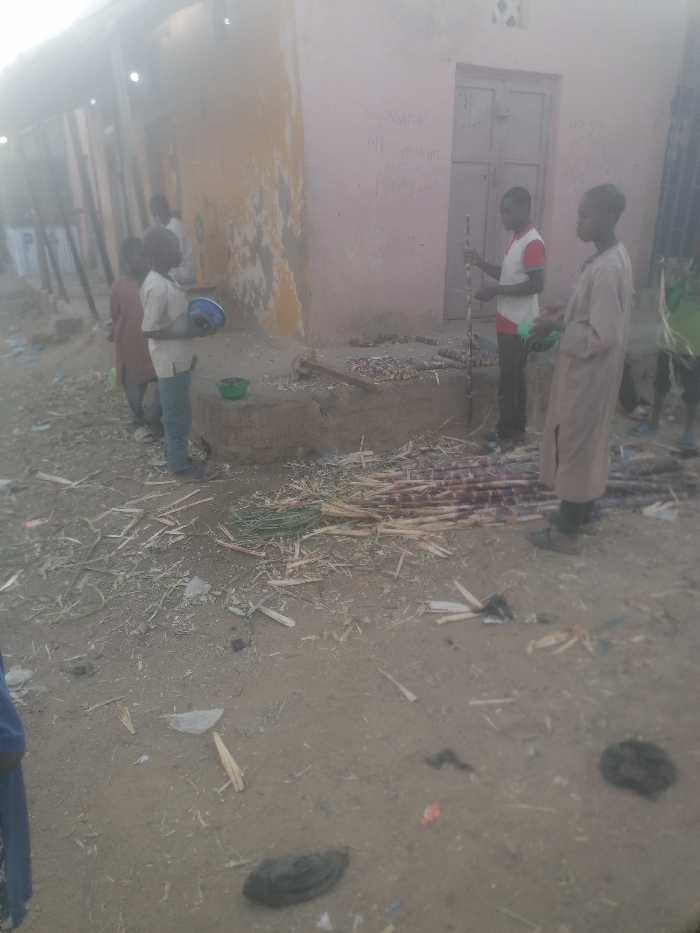 A group of young people are gathered near a small building, possibly a home, with peeling paint. Some are standing around a concrete structure with assorted objects on top, while others are next to a pile of sugar cane. Debris litters the ground. The scene appears to be a street or common area, with other structures visible in the background. The atmosphere is dusty and seems indicative of a rural or less developed area.