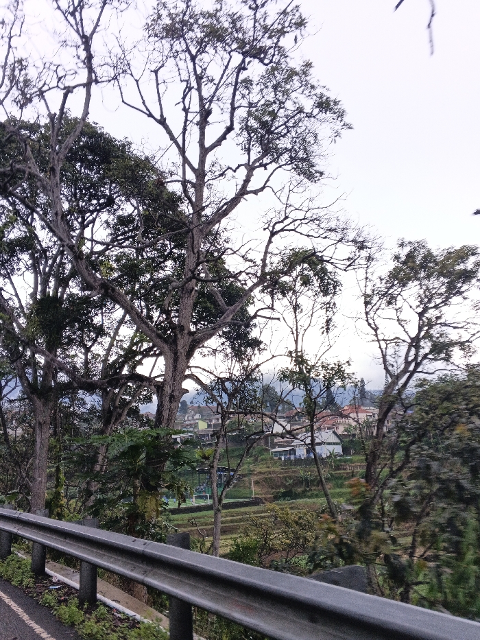 The image depicts an elevated view of a rural-urban landscape in Cipanas, Indonesia, under an overcast sky. In the foreground, a two-bar gray metal guardrail extends diagonally from the lower-left to the lower-right, bordering a segment of asphalt road visible on its immediate left, where sparse green vegetation grows. Directly behind the guardrail and extending into the midground, several large, mature trees with thick, gnarled trunks and branches dominate, some bearing dark green foliage while others appear partially defoliated. Beyond these trees, a hillside descends, characterized by terraced agricultural fields displaying shades of green and brown. In the mid-to-far background, a scattered residential area is visible, featuring numerous houses with various roof colors, predominantly red-orange and white. A distinct light-colored building with a blue section on its roof is situated among the terraced fields. The distant background reveals hazy hills or mountains beneath a pale, light-gray sky. No individuals or specific actions are depicted.