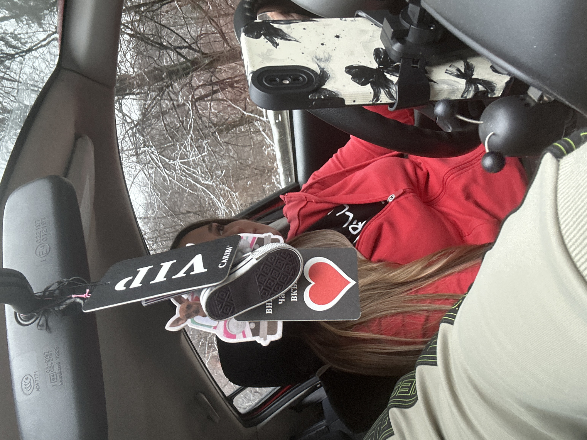 The scene depicts the interior of a vehicle, viewed from the front passenger's perspective, looking towards the driver and the road ahead. A female individual with long, light brown hair is seated in the driver's seat, wearing a red zippered hoodie over a dark shirt. Her face is largely obscured by multiple air fresheners and ornaments hanging from the rearview mirror, which include a black tag with "VIP," a cutout of a chihuahua dog, a miniature black sneaker, and a tag displaying a red heart and Cyrillic text. To the right, a smartphone in a black and white case with black bow designs is mounted in a holder attached to the steering wheel. A small black spherical object with two antenna-like protrusions is visible on the vehicle's console or dashboard in the lower right. The foreground shows the knee and lower thigh area of a person, likely the photographer, wearing light-colored sweatpants with a dark and neon green geometric pattern. Through the windshield, a snowy, wooded environment is visible. Bare tree branches are coated with a thin layer of snow, indicative of winter conditions. This scene is located within a vehicle traveling through a snowy, forested area in or around the city of Barziya, Bulgaria.