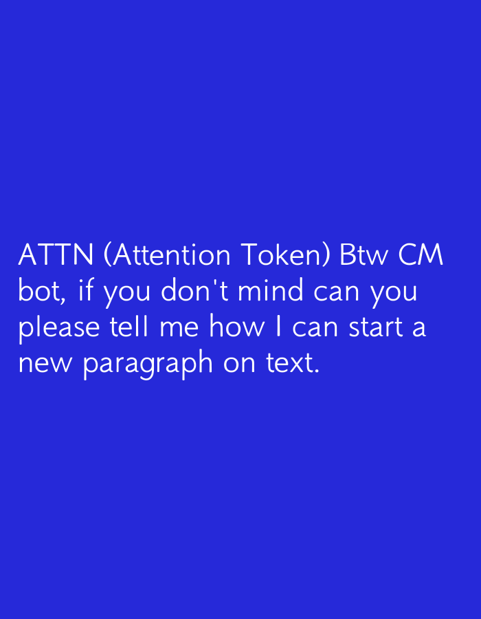 The image depicts white sans-serif text against a solid royal blue background. The text reads: "ATTN (Attention Token) Btw CM bot, if you don't mind can you please tell me how I can start a new paragraph on text." The scene is a digital interface displaying a query. No individuals or physical objects other than the displayed text are present. The location is an unidentifiable digital display.