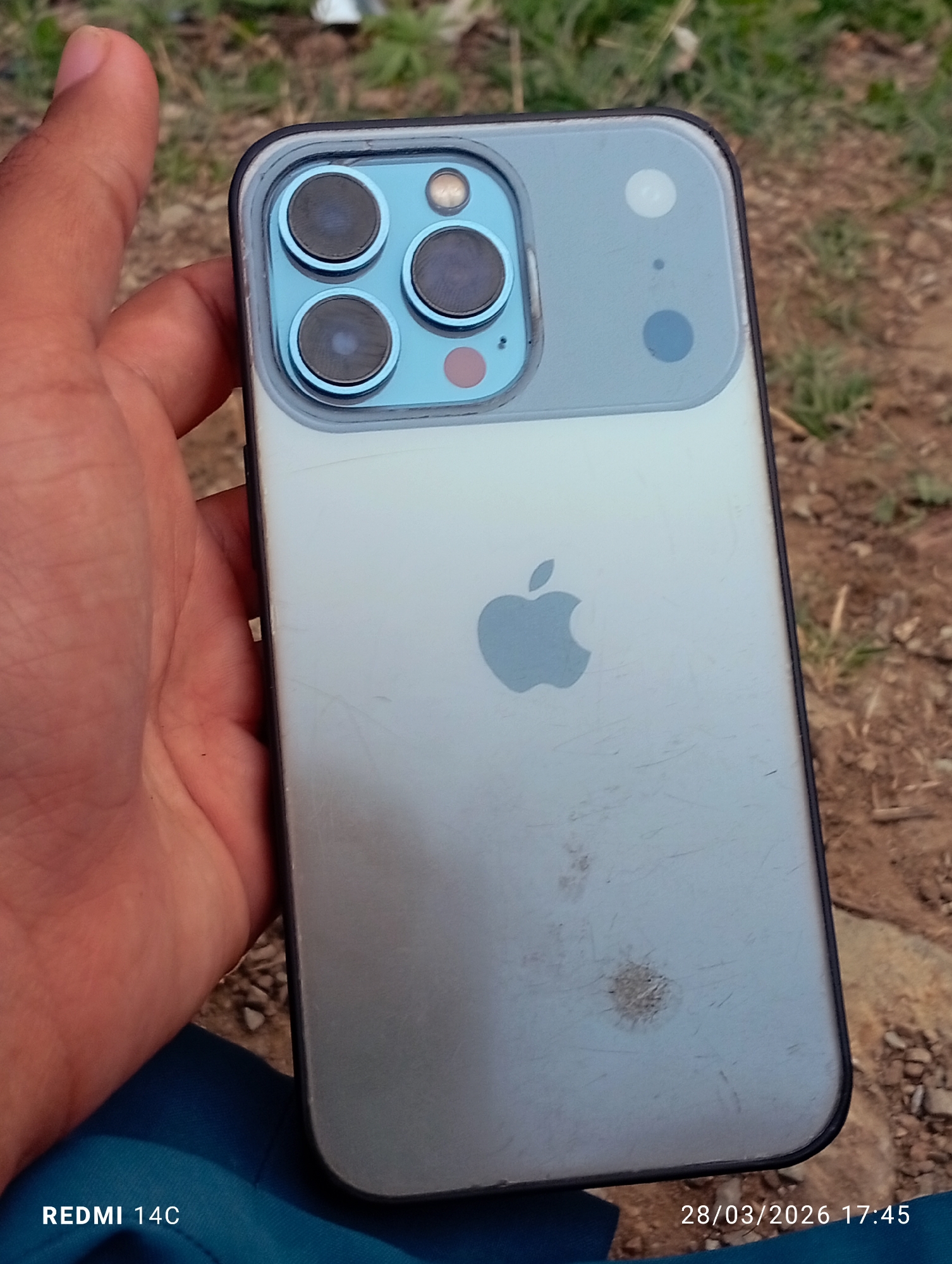 The image displays the rear side of a silver-colored Apple iPhone, held in a human hand, in an outdoor setting in Grhala, Pakistan. The phone's back features a prominent Apple logo centrally located. The upper left corner of the phone reveals a light blue camera module housing three large circular lenses, a smaller circular lens, a flash, and an additional sensor. The phone's surface exhibits multiple linear scratches and a circular dirt mark below the Apple logo. A protective case with dark edges encases the device. The hand holding the phone has a brown skin tone. Below the hand and phone, a section of dark blue fabric is visible. The background consists of disturbed brown soil with scattered small rocks and sparse green vegetation. A digital watermark "REDMI 14C" is present in the bottom left, and "28/03/2026 17:45" is in the bottom right, indicating the capture device and timestamp.