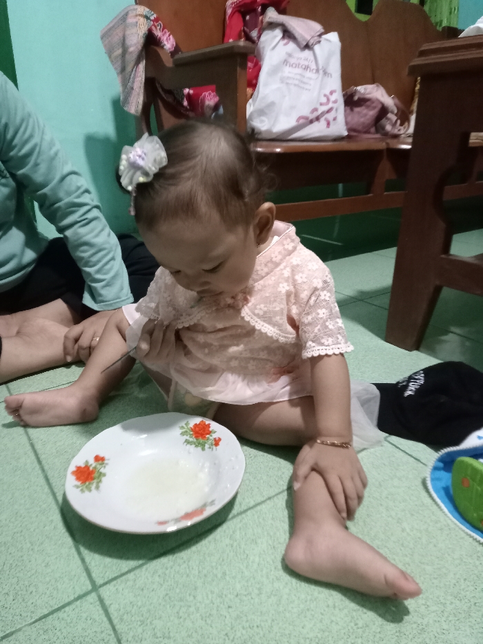 An indoor scene within Kecamatan Pati, Indonesia, depicts a young child and an adult seated on a light green tiled floor with darker green grout lines. The background features a light blue-green wall and dark wooden furniture, including a chair holding a white "matahari" shopping bag and various fabric items. The child, wearing a pink lace-patterned top with a sheer white skirt and a white bow in her dark hair, sits barefoot with her legs spread. She wears a gold-colored bracelet on her right wrist and looks downward. Her left hand holds a dark, slender utensil, while her right hand grasps her right ankle. In front of the child is a white, oval-shaped plate with an orange and green floral pattern, containing a small quantity of white liquid or food. To the child's right, a black fabric item and a blue and white mat with a green object are visible on the floor. An adult, partially visible to the left, is also seated on the floor. The adult wears a light blue-green long-sleeved shirt and dark pants. Their bare left leg is positioned next to the child, and their left hand, adorned with a ring, is near the child's left leg.